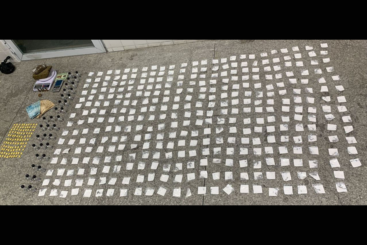 Dentro da bolsa, a polícia encontrou dois tabletes de maconha pesando cerca de meio quilo, 358 papelotes de cocaína, uma pedra de crack, frascos de “loló”, comprimidos de ecstasy, munições calibre 38, duas balanças de precisão e mais de R$ 1,3 mil em espécie.