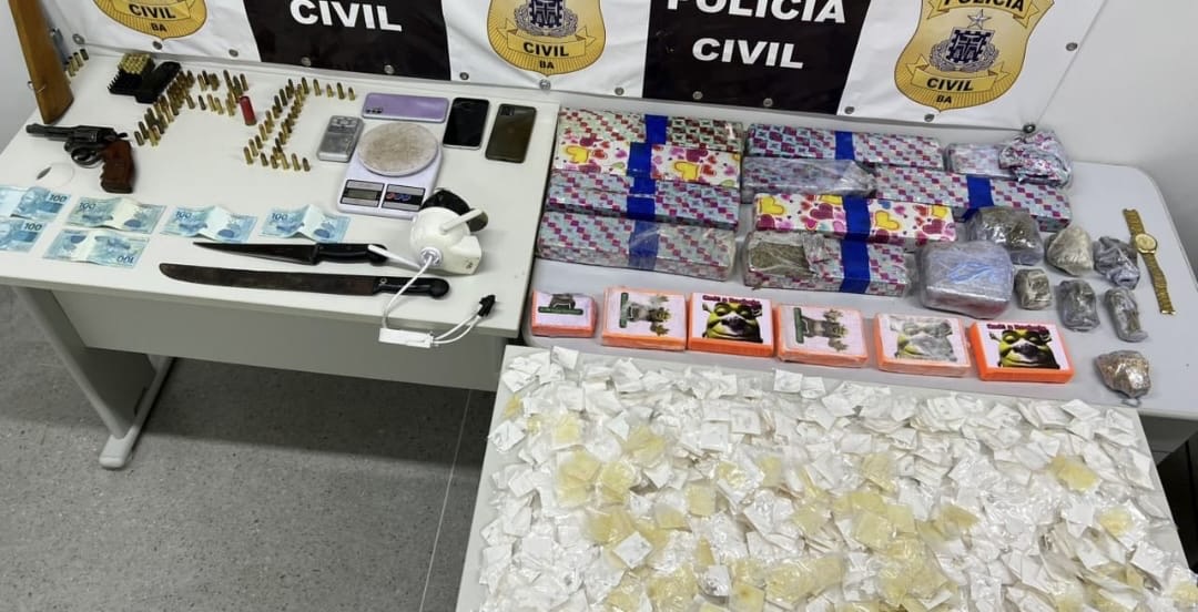 Foram apreendidos um revólver calibre .38, uma espingarda caseira, mais de 100 munições de vários calibres, 1.340 porções de cocaína, 17 tabletes de maconha, uma porção de crack, balanças de precisão, celulares, câmera de monitoramento e R$ 600 em dinheiro.