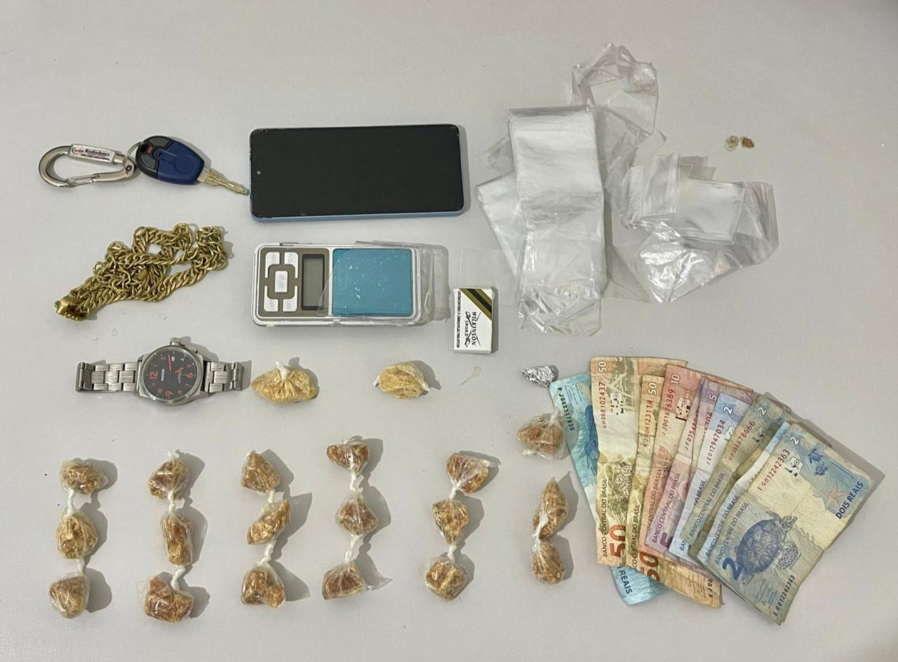 Durante a abordagem a um carro suspeito, os policiais encontraram 21 pedras de crack, uma balança de precisão, embalagens plásticas e R$ 230 em dinheiro.