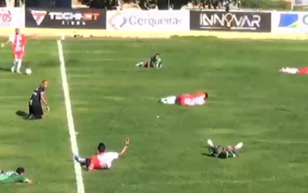 Jogadores deitam no chão após invasão de insetos durante partida de futebol no interior da Bahia