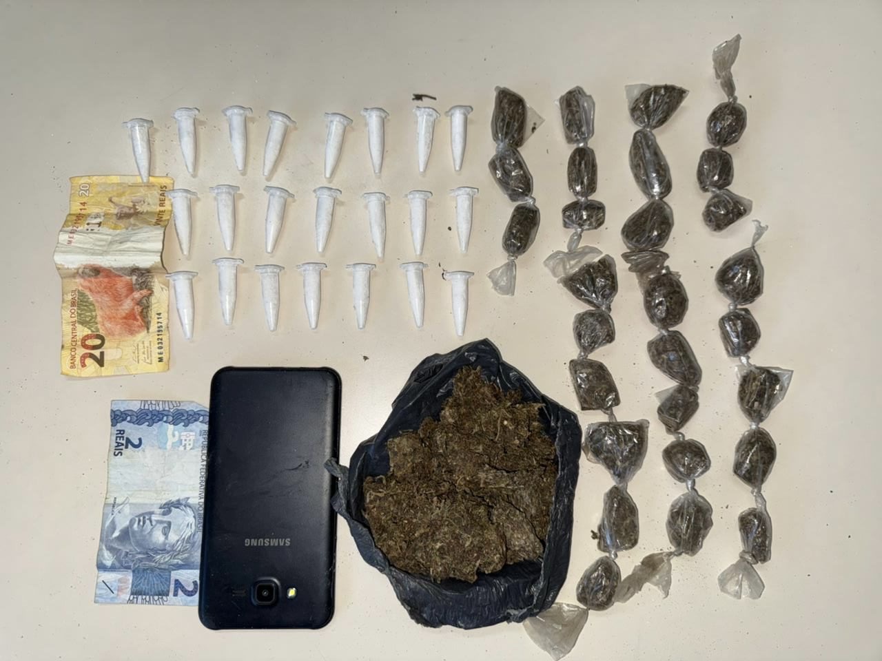 Os militares apreenderam 90 gramas de maconha, além de 28 trouxinhas da mesma droga e 22 pinos com cocaína.